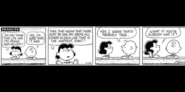 Sfortunatamente, nessuno sa qual è il momento migliore della sua vita. Miseria Lucy e Charlie Brown catturano una realizzazione indimenticabile in questa striscia, mentre discutono dei picchi e delle valli della vita . Una volta, Lucy guarda le cose più ciniche. Tieni presente che un giorno devi essere migliore di tutto. I giovani lettori hanno una vita prima di loro e i loro giorni migliori potrebbero essere in vantaggio. Ma per gli adulti è calmo pensare che i loro giorni migliori siano probabilmente un ricordo del passato.