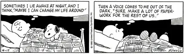 Non importa come sei l'età, non è raro pensare a come apparirà il tuo futuro. Qui, Miseria’ Charlie Brown e Linas Van Pelt discutono di come vedranno quando invecchiano , chiese a Charlie Brown cosa voleva essere quando è cresciuto, facendo contrastare Linus la risposta più acuta. Un'incredibile felicità. . È una striscia umoristica, ma il vecchio può guardare indietro nella speranza e nei sogni che ha avuto per il futuro e diventare indimenticabile.