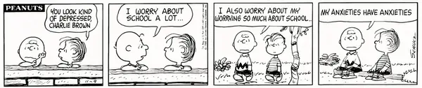 Ancora una volta, Charlie Brown la porta tra le maniche senza nascondere le sue emozioni di arachidi. In questa striscia, Linus raccoglie e consente l'atteggiamento e i commenti dell'amico al riguardo Charlie Brown discuterà di come è preoccupata per la scuola e anche per quello che è. . È un'osservazione commedia decente, ma è anche incredibilmente importante per le persone con disturbi d'ansia generalizzati. Una volta che inizia ad attenersi alle cose, la sua spirale diventa più facile, soprattutto quando un'età, la paura e l'ansia iniziano a crescere.