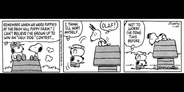 Miseriaで悪い感情に苦しんでいるのはチャーリー・ブラウンだけではありません。このbandaでは、スヌーピーが彼の兄弟オラフと物事について話しています。 Quando ho lasciato il canile snoopy, dico solo che Olaf lo ha fatto prima, quindi va bene . Le arachidi lo giocano a fumetto, ma il tetto di sé è serio e i bambini possono leggerlo e vedere gag divertenti, ma è doloroso per coloro che sono coinvolti nelle auto -inferenze.