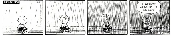 Letteralmente, quando piove, viene riversato in Charlie Brown. Non c'è molto da dire su questa striscia. Invece, è solo Seduto sotto la pioggia, Charlie Brown si siede sotto la pioggia, il che gradualmente peggiora così tanto che cerca di aspettarlo Stai sempre piovendo qualcuno che piange con frustrazione? Sfortunatamente, con l'età, più persone saranno associate a tale mentalità. Quando siamo già in una brutta situazione, può sembrare che tutti stiano cospirando in modo molto personale.