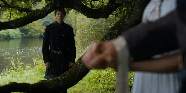 In questo momento, John consiglia a Blanc di non guardare dall'altra parte, indicando che, come nel libro, il lettore sta ancora assistendo a questo momento dal punto di vista di Blanc. Se è intenzionale, è un momento intelligente per raggiungere due obiettivi. Metti John come aringa rossa come candidato per diventare il futuro re , ma mostra il vero re futuro della stessa cornice. Guardando indietro, sembra una traccia abbastanza ovvia su chi raggiungerà il trono di ferro.