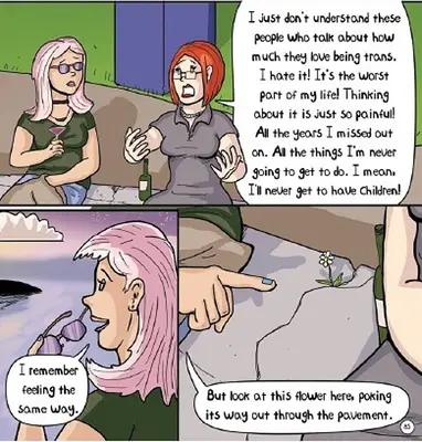 Il momento più cruciale del romanzo è caratterizzato da Lily che parla della sua frustrazione con un'altra donna trans, Kara e il suo trans. Kara risponde semplicemente a Lily, che sottolinea gli aspetti negativi della trance che mostrano fiori che crescono dal marciapiede. Lo dice a Lily. Solo per prosperare, devono farsi strada attraverso il cemento. Ma, tuttavia, è qui. Fiorente. Bello come altri fiori . 'Questa è una scena importante che dimostra che le transizioni possono essere difficili, ma il risultato finale è prezioso e un messaggio importante per il pubblico di Trans Symington.