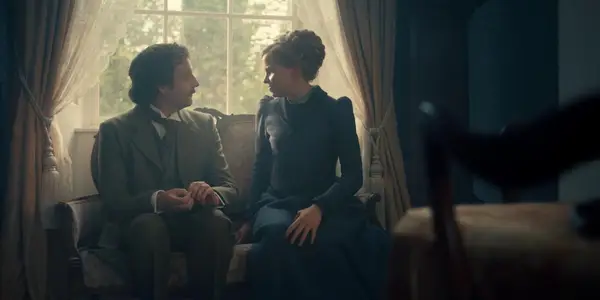 Miss Scarlet and Detective Fitzroy talk while standing on a stoop in Miss Scarlet and the Duke