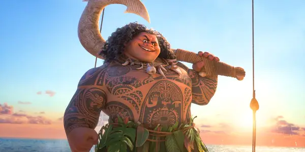 Maui con il gancio appoggiato sulla sua spalla a Moana 2